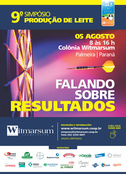 Informações sobre o 9º Simpósio Produção de Leite e inscrições, com vagas limitadas, disponíveis no site da Cooperativa Witmarsum (www.witmarsum.coop.br), pelo telefone (42) 3254-4047 ou solicitadas pelo e-mail: simposio@witmarsum.coop.br.