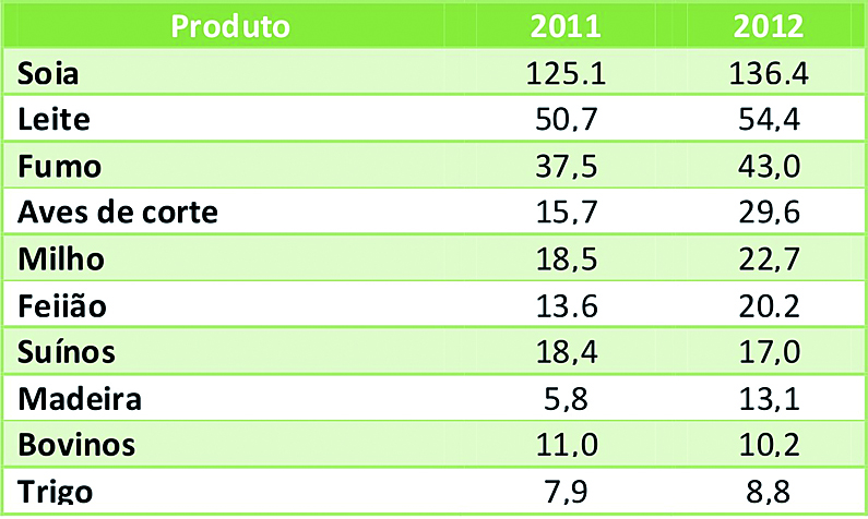 Na segunda colocação em ordem de importância econômica está o leite, que em 2011 representou valor bruto de R$ 50,7 milhões e em 2012 subiu para R$ 54,4 milhões.