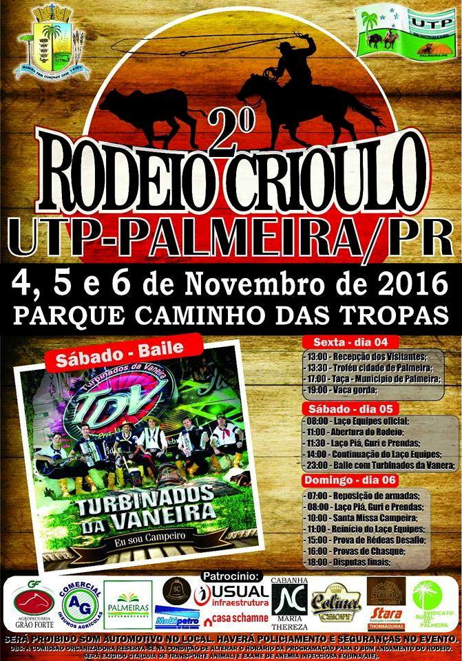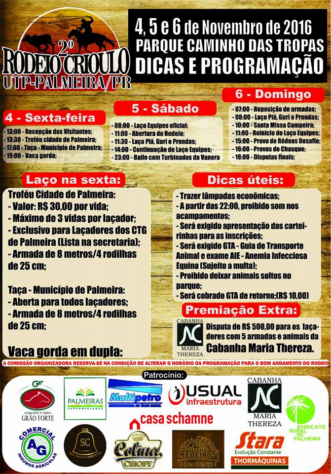 Tradicionalistas de Palmeira e região estão sendo convidados a participar do 2º Rodeio Crioulo que acontece de 4 a 6 de novembro no Parque Caminho das Tropas. A programação inicia na sexta-feira (4) às 13 horas com a recepção aos visitantes, em seguida às 13h30 com o Troféu Municipal; às 14 horas com o Troféu Cidade e às 15 horas Laço Dupla e a premiação será uma moto 0 KM, a inscrição será de R$ 60,00 a dupla e classifica a dupla com 6 armadas positivas por pelotão. Para encerrar a programação às 19 horas com a realização da Vaca Gorda em dupla.