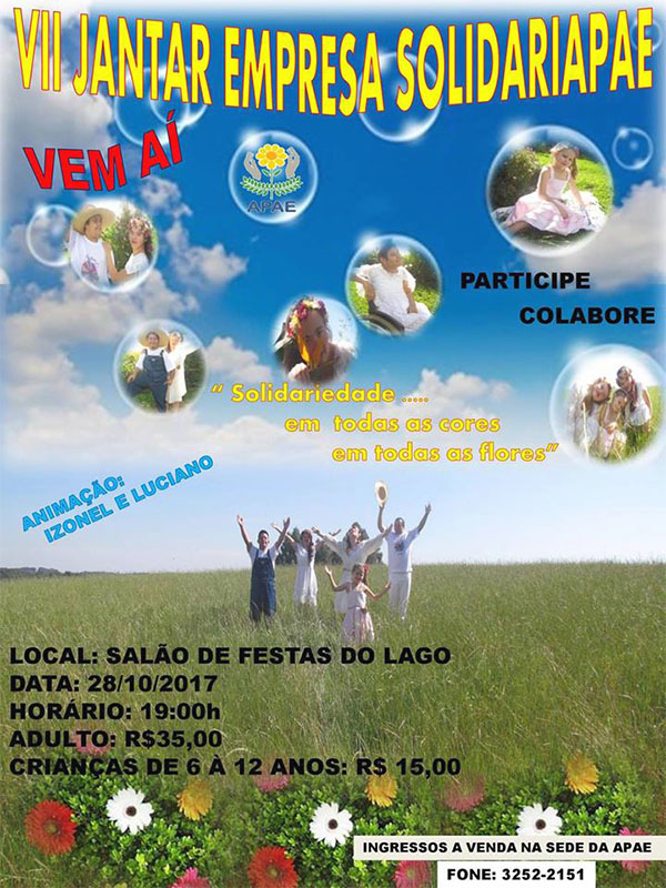 Com o tema “Solidariedade…em todas as cores, em todas as flores”, a Apae de Palmeira promove no dia 28 de outubro, a partir das 19 horas, o 7º Jantar Empresa SolidariApae no salão de festas da comunidade do Lago. O objetivo arrecadar recursos para a manutenção das atividades da escola, que recentemente completou 37 anos. Além do tradicional cardápio, durante o evento acontecerá à entrega dos certificados de participação das empresas no projeto, como forma de reconhecimento da APAE da importância do envolvimento das empresas.