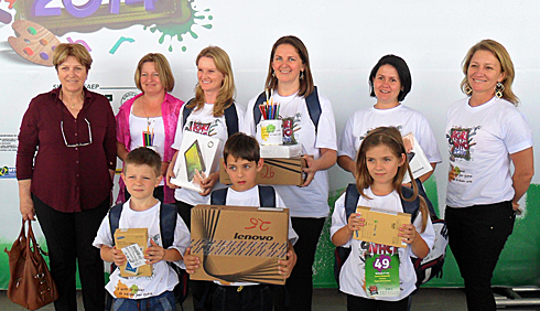 Cinco estudantes de escolas municipais de Palmeira receberam prêmios, na segunda-feira (10), pelo reconhecimento de seus trabalhos de desenho e redação no programa Agrinho 2014, que este ano teve realizada a sua 19ª edição, com o tema “As coisas que ligam o campo e a cidade e nosso papel para melhorar o mundo“. Destaque para Luís Gustavo Voichicoski, aluno da Escola Municipal Pedro Gross filho, da localidade de Pinheiral de Baixo, classificado em primeiro lugar, em nível estadual no concurso de desenho categoria 1º Ano. Ele foi premiado com um tablet e um notebook, comparecendo à solenidade de premiação com sua professora, Neliana Swiech, e a diretora da escola, Mariele Borcoski Costa.