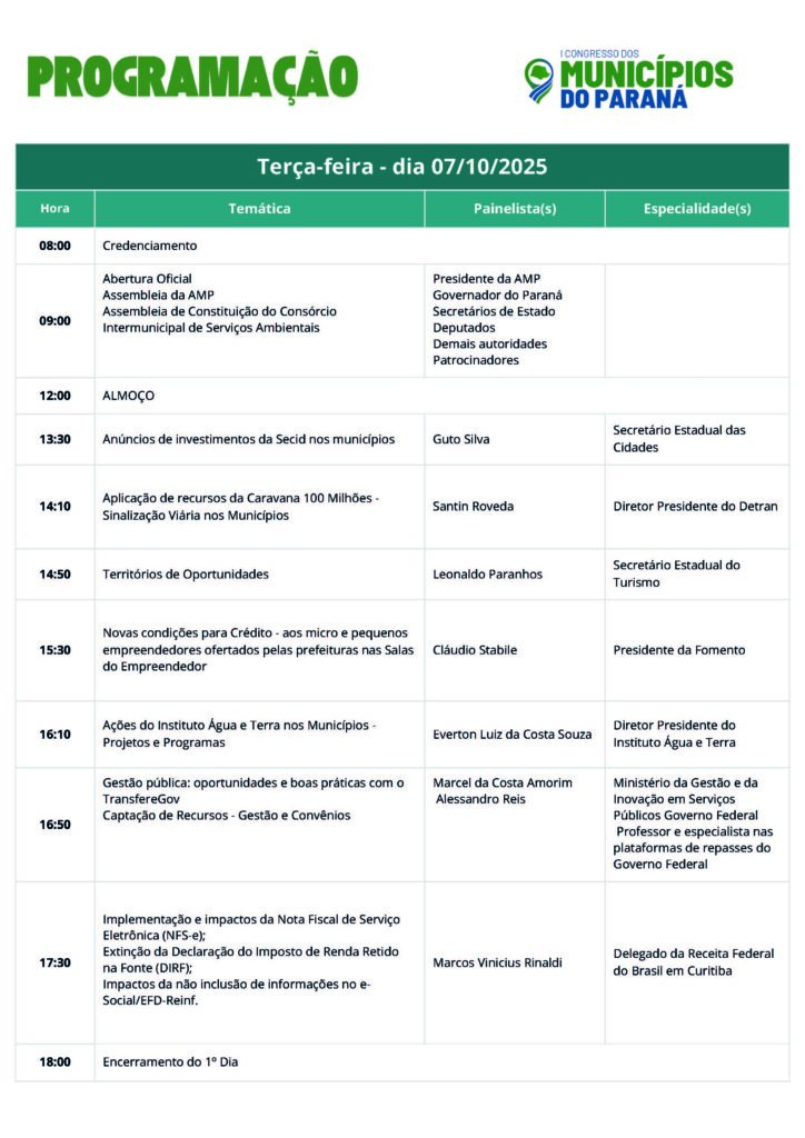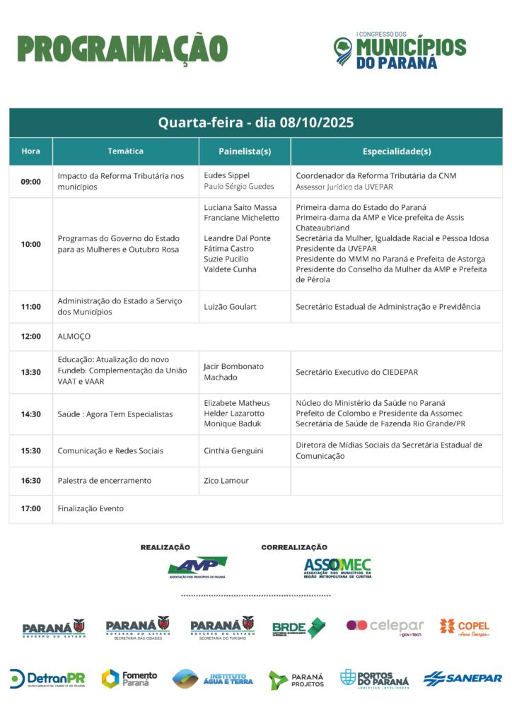 “A presença do governador Ratinho Junior no congresso comprova seu compromisso com os municípios do Paraná. Por isso e pela importância dos temas que serão tratados, convido todos os prefeitos e prefeitas do Estado a estarem presentes com suas equipes neste grande evento municipalista”, avalia.