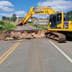 Máquinas trabalham desde cedo na implantação do acesso ao local da obra, ao lado da rodovia, bem como nos serviços de desvio do curso de água, necessário para a próxima etapa da recuperação do trecho.