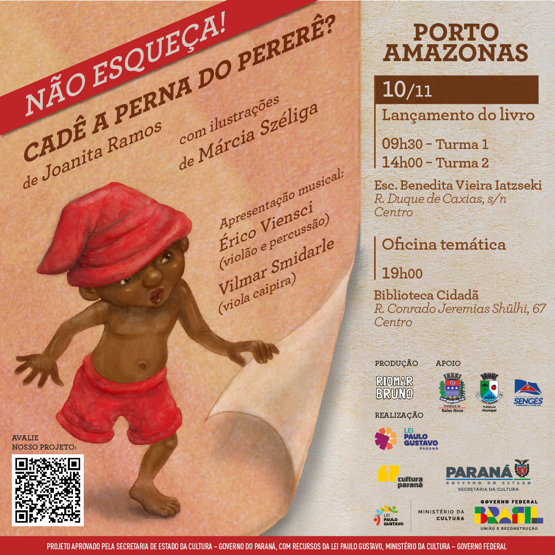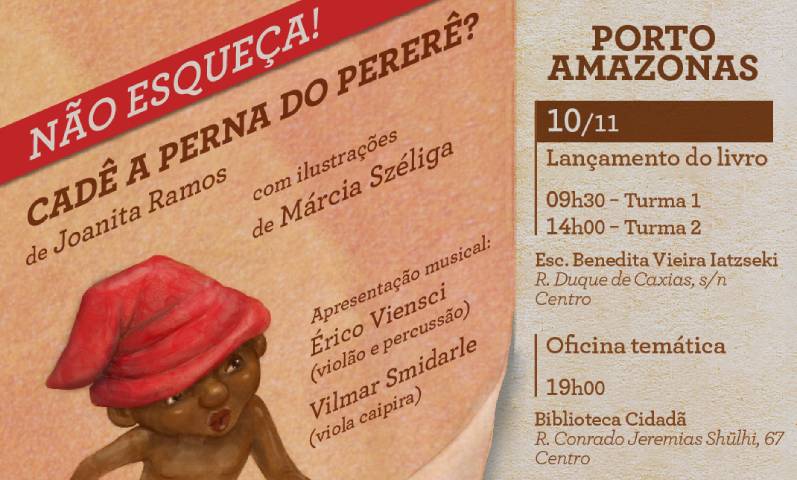 “Cadê a Perna do Pererê?” é o título do livro que a Editora Ramos Multiculturais e o Projeto Menina Preta trarão às crianças de Porto Amazonas, no mês de novembro. A obra, da autora Joanita Ramos, tem ilustrações da artista plástica Márcia Széliga e será lançada no dia 10 para alunos da Escola Benedita Vieira Iatzseki, com contação da história feita pela autora, incorporada a um pocket show dos músicos Érico Viensci e Vilmar Smidarle. No mesmo dia na Biblioteca Cidadão, haverá uma oficina de leitura em público, para estimular os adultos a lerem para as crianças.