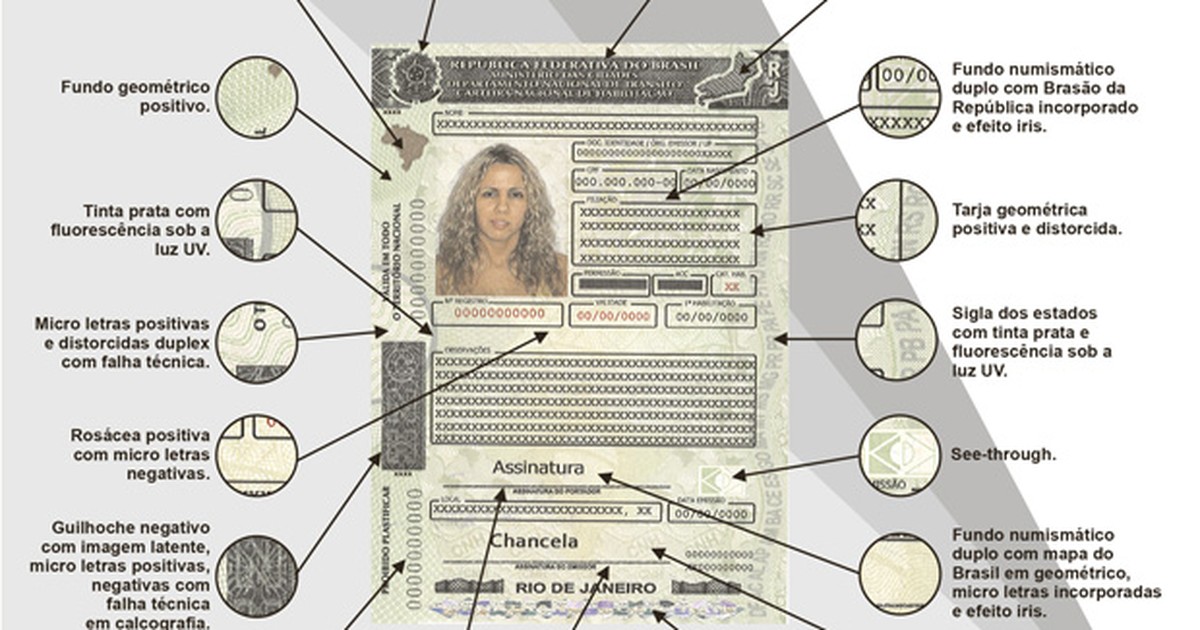 Com o novo design, a tarja que fica no topo do documento (atualmente azul esverdeada) passará a ser preta e a ter, no lado direito, o mapa do Estado em que a CNH for emitida. No canto superior direito, um mapa do Brasil será impresso com tinta de variação óptica, que dificulta a falsificação da carteira.