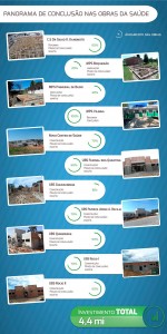 A maior parte das obras já está com mais de 50% de conclusão, com destaque para as construções do novo Centro de Saúde, da UBS no Núcleo Parque dos Papiros e UBS do bairro do Rocio, que já estão 70% concluídas.