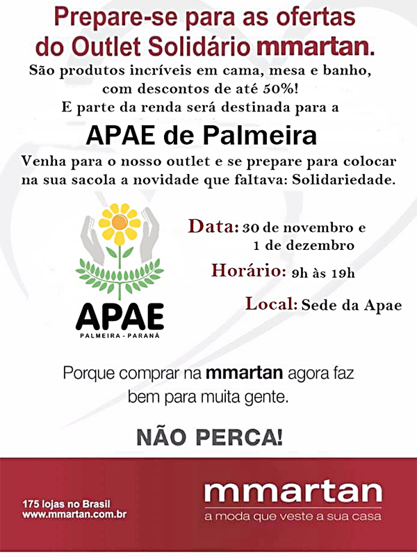 Você que pretende adquirir bons produtos na linha cama, mesa e banho com preços acessíveis, não pode ficar de fora dessa promoção. Nos dias 30 de novembro e 1º de dezembro será realizado na sede da Apae de Palmeira das 9 às 19 horas, o outlet Solidário mmartan.