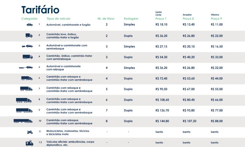 Caminhão, caminhão trator com semirreboque e ônibus (todos com 3 eixos e rodagem dupla) têm tarifas entre R$33,00 e R$54,30. Os valores das tarifas para caminhão com reboque e caminhão trator com semirreboque, com rodagem dupla, variam conforme o número de eixos. As tarifas partem de R$22,00 para 4 eixos e podem chegar a R$144,80 com 8 eixos, a depender do pórtico.