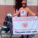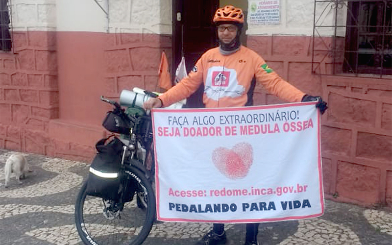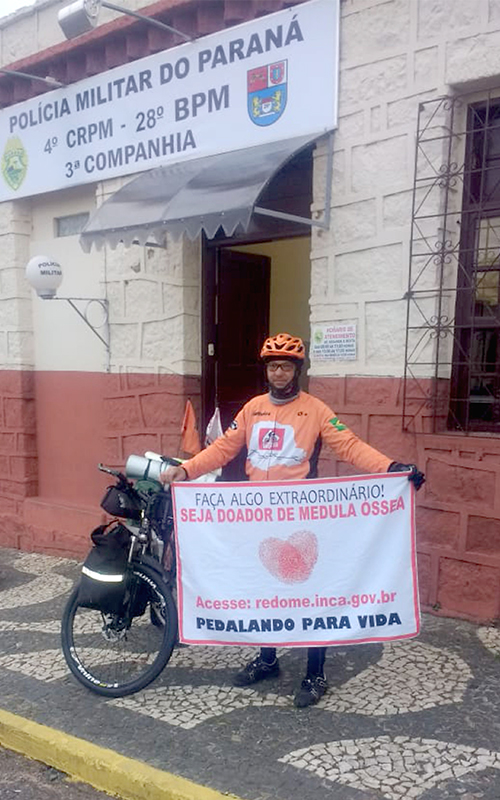 Com o slogan “Faça algo extraordinário!” Seja doador de medula óssea, o soldado da Polícia Militar faz a campanha “Pedalando para Vida”, para incentivar as pessoas a se inscreverem no Registro Nacional de Doadores de Medula Óssea (Redome).
