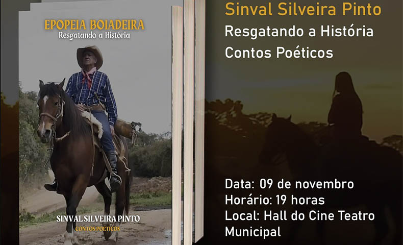 Ao ressoar do berrante, o Poeta Sinval Silveira Pinto anuncia o lançamento de sua mais recente obra literária, intitulada “Epopeia Boiadeira – Resgatando a História”. O evento de lançamento está agendado para o dia 9 de novembro, às 19 horas, no Cine Teatro Municipal em Palmeira. De acordo com Sinval suas raízes como ‘peão boiadeiro’ está fincada na cidade.