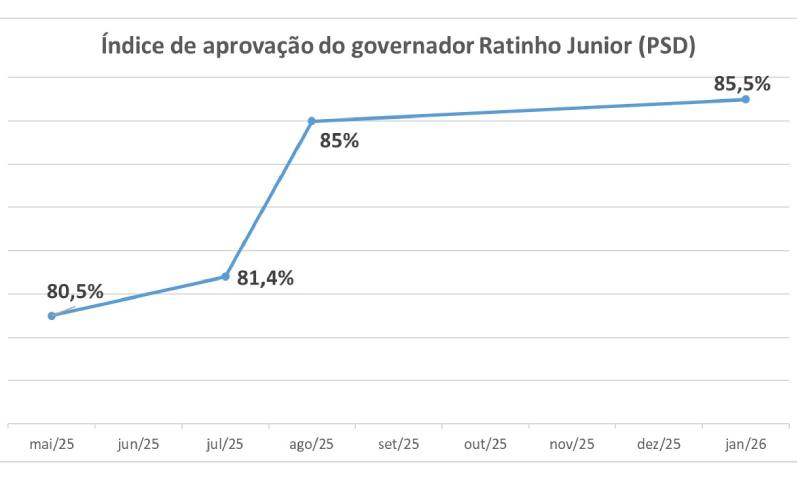 O governador do Paraná, Ratinho Junior (PSD), renovou o recorde de aprovação e alcançou 85,5% entre os eleitores paranaenses em janeiro de 2026. É o que aponta o mais recente levantamento do instituto Paraná Pesquisas, divulgado nesta sexta-feira (23).