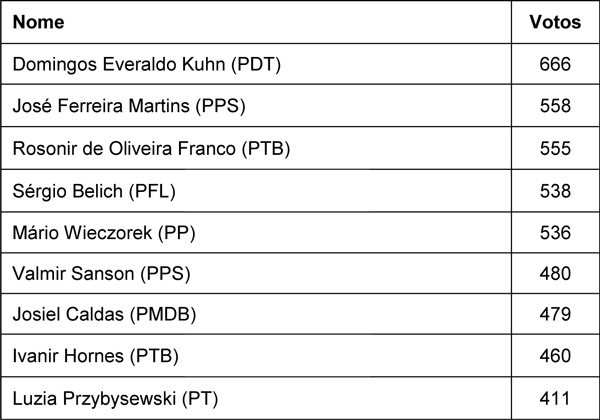 Altamir -Diplomação 2004A eleição municipal de 2004 foi marcada por uma vitória inques-tionável de Altamir Sanson, candidato a prefeito pelo PPS, em coligação formada ainda pelo PTB, PSL, PL e PRTB, que arrebatou quase 52% dos votos na disputa pela Prefeitura Municipal, concorrendo contra dois adversários: Egon Krambeck, do PP, em coligação com PFL, PTC, PRP e PSDB, e José Przybysewski, do PT, coligado com PDT, PMDB, PSC, PHS, PV e PCdoB. Com isto, Sanson conquistou o seu segundo mandato de prefeito de Palmeira, pois já havia exercido o cargo no período entre 1993 e 1996.