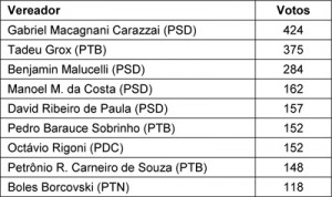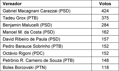 Mesmo tendo seu candidato derrotado na eleição para prefeito, o PSD manteve a tradição de eleger a maior parte das vagas para vereador. O partido conquistou quatro das nove cadeiras na Câmara Municipal, mas isto não foi o suficiente para que a até então situação mantivesse a maioria no Legislativo, uma vez que os partidos que apoiaram a candidatura de Daniel Mansani, juntos, com seguiram eleger cinco vereadores. Todos os quatro partidos que registraram candidatos a vereador conseguiram eleger pelo menos um representante para a Câmara Municipal.