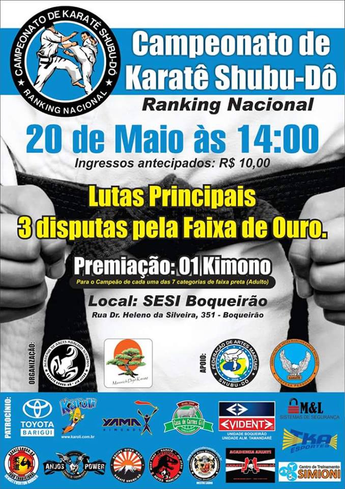 Amanhã, atletas de Palmeira vão participar do Campeonato de Karatê Shubu-Dô pelo ranking nacional em Curitiba/PR. O campeonato inicia às 14 horas e acontece no SESI Boqueirão. A equipe Karatê Guerra estará participando e esperam trazer bons resultados para a cidade.
