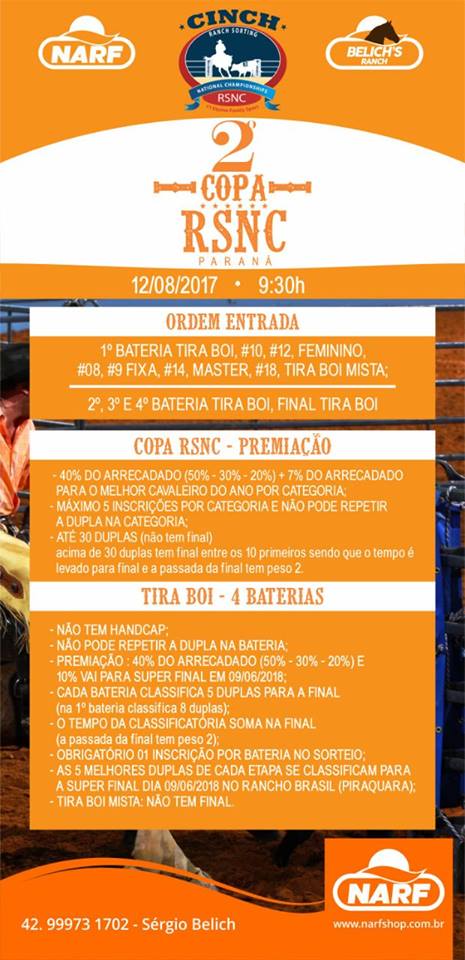 Competidores de todo o Paraná devem participar no dia 12 de agosto a partir das 9h30 da 2ª Prova de RSNC de Ranch Sorting – 1ª etapa que acontece no Belich´s Ranch na localidade de Colônia Quero Quero. De acordo com o proprietário do Belich´s Ranch Sérgio Luiz Belich, serão sete etapas entre 1º de agosto de 2017 até 30 de junho de 2018.