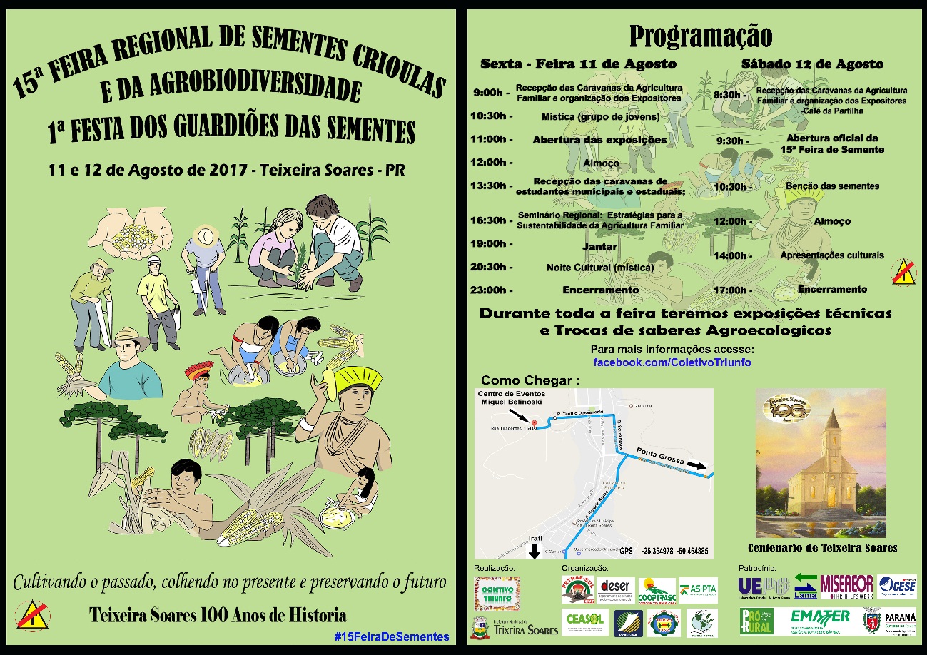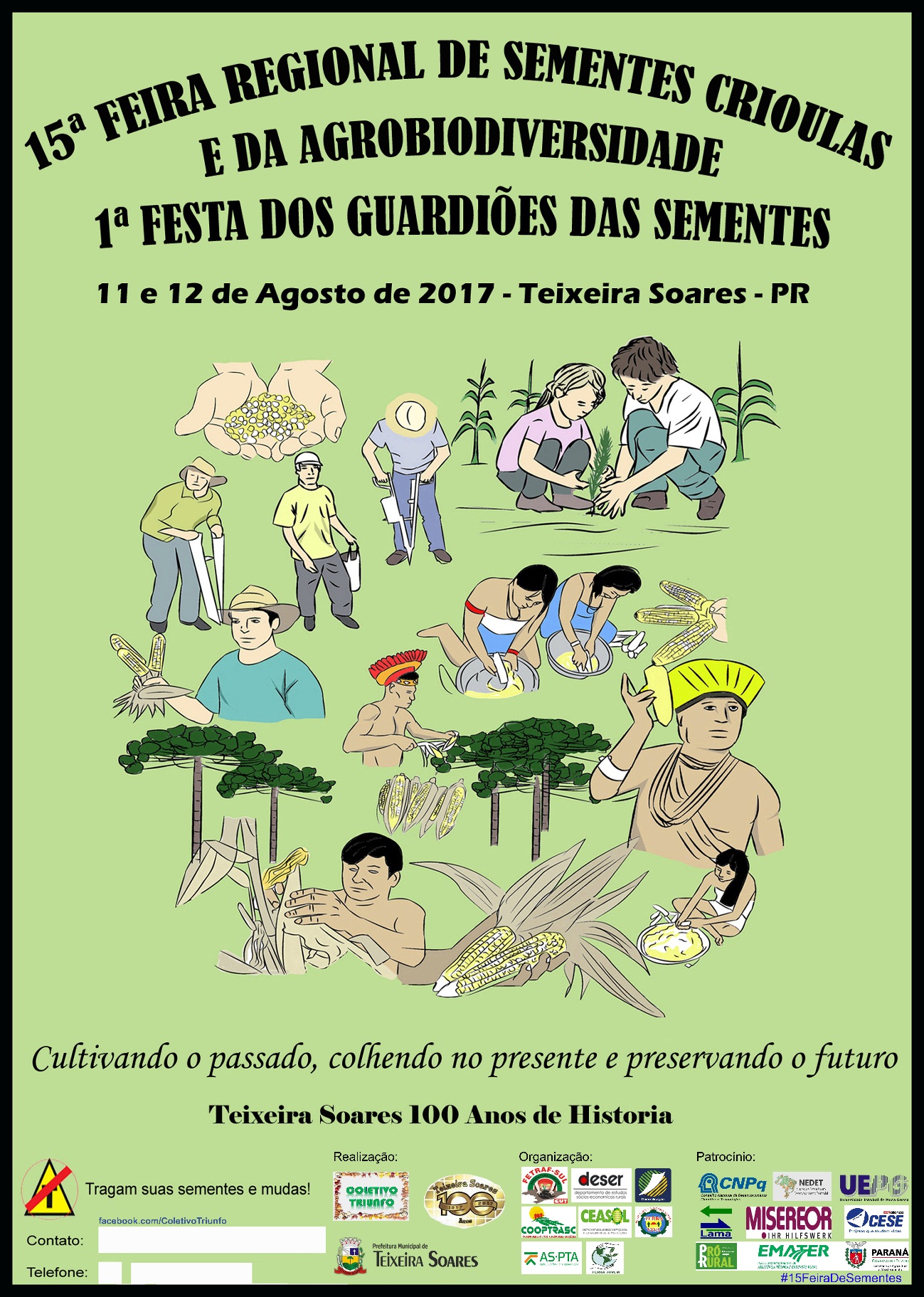 A 15ª Feira Regional de Sementes Crioulas e da Biodiversidade será nos dias 11 e 12 de agosto no Centro de Eventos Municipal de Teixeira Soares e contará com a participação de agricultores familiares, organizações de base e entidades da sociedade civil e governamental. Para este ano são esperados mais de 100 expositores ligados a agricultura familiar e um público de 3000 pessoas do Brasil inteiro ligados a conservação da agrobiodiversidade.