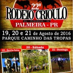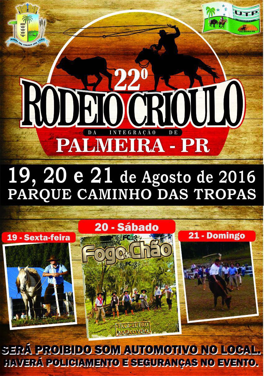 Inicia nesta sexta-feira (19) o 22º Rodeio Crioulo de Integração no Parque Caminho das Tropas em Palmeira. O rodeio acontece até o domingo (21) e terá uma extensa programação. No dia 19, inicia às 13 horas com a recepção aos visitantes, as 13h30 o Troféu Cidade de Palmeira, às 17 horas Taça Município de Palmeira e às 19 horas, a Vaca Gorda.
