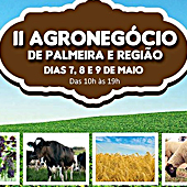 Entre os dias 7 e 9 de maio, acontece o 2º Agronegócio Palmeira e Região, promovido pela Secretaria de Agricultura da Prefeitura de Palmeira. O evento tem por objetivo difundir tecnologia e promover negócios entre fornecedores e consumidores de máquinas, equipamentos, veículos, insumos e serviços para o setor agrícola, bem como fomentar investimentos através de linhas de crédito oficiais do banco do Brasil e da Caixa Econômica Federal.