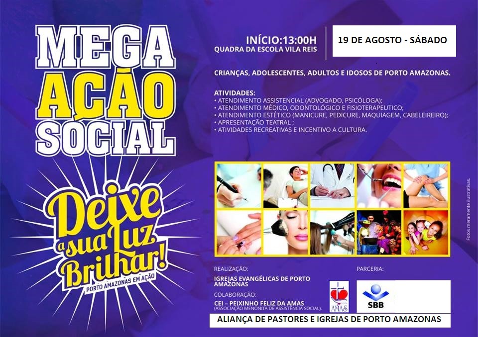No sábado (19) a partir das 13 horas com a realização da Aliança das Igrejas Evangélicas de Porto Amazonas e com a colaboração da Sociedade Bíblica do Brasil (SBB), em parceria com a Associação Menonita de Assistência Social (AMAS), acontece a 4ª Edição Mega Ação Social do projeto. Segundo os organizadores será uma grande ação social com o slogan “Deixe sua Luz Brilhar” Porto Amazonas em ação.