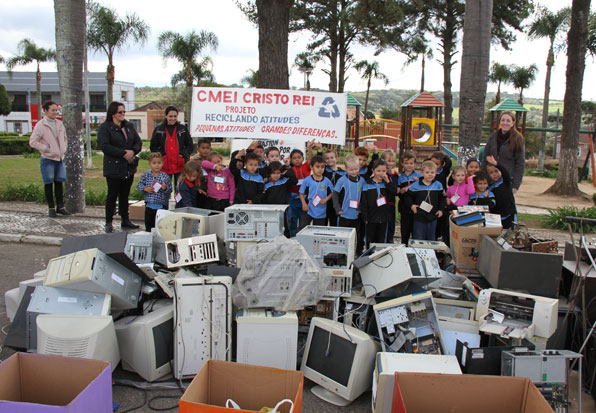 Alunos do Centro Municipal de Educação Infantil (CMEI) Cristo Rei, no bairro do Rocio, participaram do projeto ambiental Reciclando Atitudes, desenvolvido por professoras do estabelecimento em parceria com a Secretaria de Meio Ambiente. Os estudantes realizaram atividades práticas, como oficina de brinquedos recicláveis, teatro e coleta de lixo eletrônico.