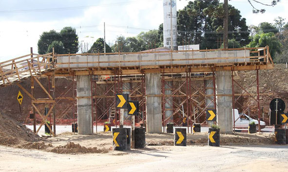 O ritmo das obras do viaduto que interligará o Centro à Colônia Francesa continua acelerado. Com a estrutura base que sustentará a obra praticamente pronta, o próximo passo é o assentamento das vigas transversais, sobre a BR-277.