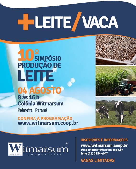 O 10° Simpósio de Produção de Leite, na Colônia Witmarsum vai acontecer no dia 4 de agosto. O evento é realizado pela Cooperativa Witmarsum e conta com parceria de empresas do ramo leiteiro.