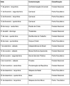Veja abaixo a lista de feriados e pontos facultativos: