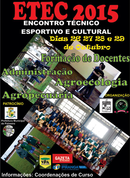 Entre os dias 26 e 29 deste mês, Palmeira tem um evento inédito acontecendo e reunindo estudantes de quatro cursos técnicos. É o Encontro Técnico Esportivo e Cultural (ETEC), do qual participam os cursos de Técnico em Agropecuária e Técnico em Agroecologia, ambos do Colégio Agrícola Estadual Getúlio Vargas, e Técnico em Administração e Formação de Docentes, do Colégio Estadual Dom Alberto Gonçalves. O ETEC é promovido e organizado pelos dois colégios e tem apoio da Prefeitura de Palmeira.