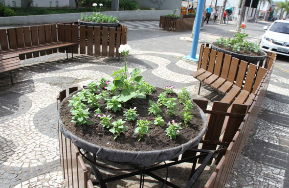 As floreiras dos bancos de descanso da rua Conceição estão ganhando a implantação de novas plantas nas estruturas disponíveis. A medida, além de melhorar esteticamente, vai trazer mais vida a um dos pontos mais movimentados da cidade.