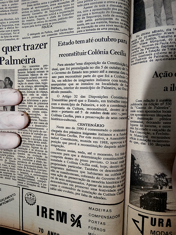 O trabalho se deu através das páginas do Jornal Gazeta de Palmeira entre os anos de 1990-1995 (período que incorpora o centenário da Colônia), 2003 (ano da formação da rota rural “Caminhos da Cecília”) e também entre os anos de 2015-2016 (período da inauguração oficial do Memorial da Colônia Cecília e da retomada do projeto da rota da Colônia), os quais foram selecionados devido a ligação com momentos específicos da história da Colônia Cecília, buscando e fotografando qualquer matéria do jornal que tivesse ligação com a Colônia Cecília, para a partir de então, buscar compreender como ela foi abordada em seu conteúdo e importância.