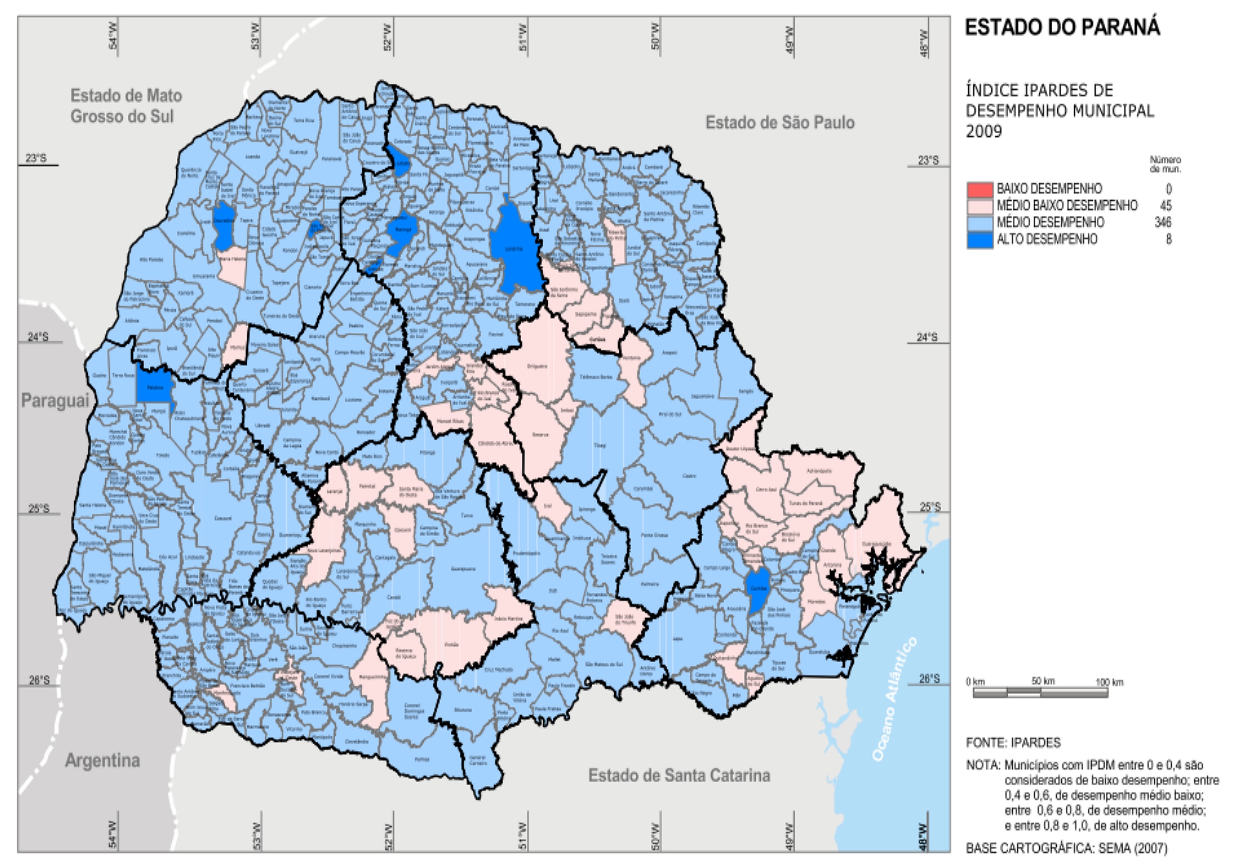 Entre os 399 municípios paranaenses, 312 apresentaram melhora no índice geral do IPDM entre 2008 e 2009, mas 87 registraram redução. Todos ficaram posicionados a partir do estágio de médio baixo desempenho. Apenas oito municípios encontram-se no estágio de alto desempenho, 345 no de médio, 45 no de médio baixo. Nenhum está no nível de baixo desempenho.