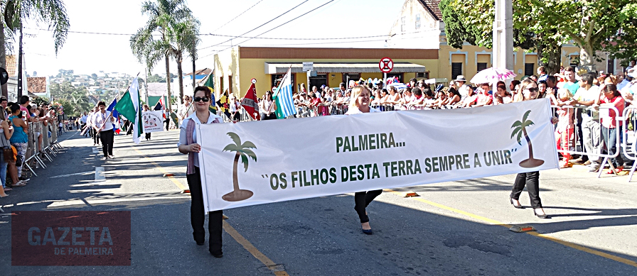 Milhares de pessoas foram à rua 15 de Novembro, na manhã de quinta-feira (7), para acompanhar o desfile cívico militar em comemoração aos 197 de Palmeira. Os presentes puderam acompanhar alunos de Centros Municipais de Educação Infanil (CMEI), escolas municipais, colégios estaduais e um particular, APAE, Educação de Jovens e Adultos (EJA), a Fanfarra do Colégio Estadual José Elias da Rocha (Cejer), de Ponta Grossa, a União Tradicionalista de Palmeira (UTP), equipes da Prefeitura Municipal, Corpo de Bombeiros e o Exército Brasileiro, que encerrou o evento.