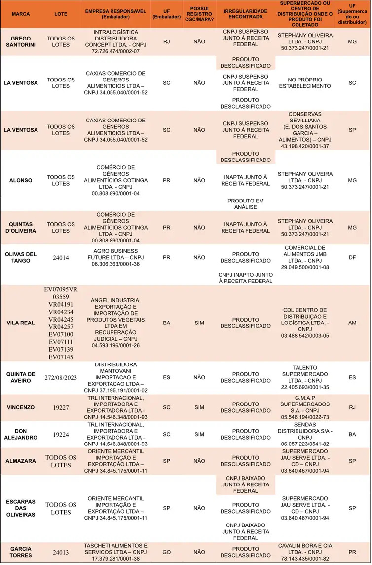 As doze marcas desclassificadas por fraudar seus produtos são a Grego Santorini; La Ventosa; Alonso; Quintas D’Oliveira; Olivas Del Tango; Vila Real; Quinta de Aveiro; Vincenzo; Don Alejandro; Almazara; Escarpas das Oliveiras e Garcia Torres.