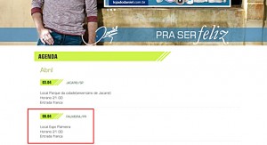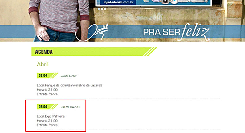Na agenda de shows, que está disponível no site oficial do cantor (www.daniel.uol.com.br), a apresentação em Palmeira está confirmada para o sábado.