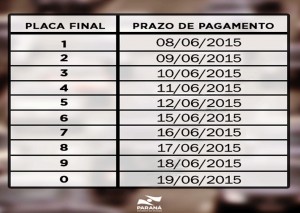 A Secretaria da Fazenda do Paraná alerta que o prazo para pagamento do Imposto sobre a Propriedade de Veículos Automotores (IPVA), relativo ao exercício de 2015, termina na próxima semana. As datas de quitação da terceira e última parcela vão de 8 a 19 de junho, conforme a placa do carro (ver tabela abaixo).