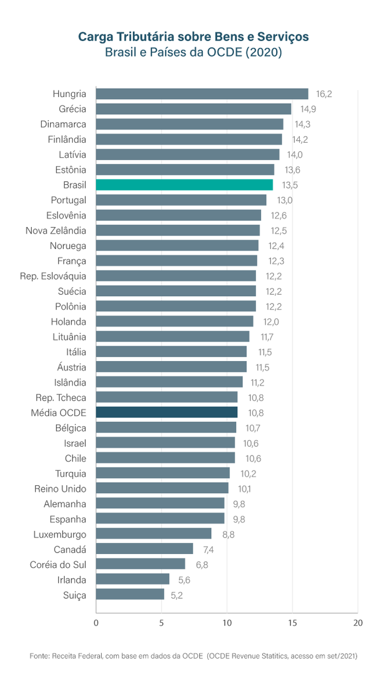 Por outro lado, o imposto sobre bens e serviços no Brasil (13,5% do PIB) mostra-se superior ao praticado na média dos países da OCDE (10,8%).
