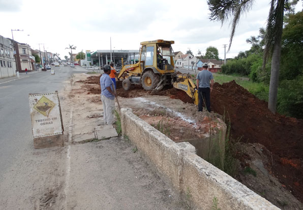 Já na esquina da rua 15 de Novembro e avenida 7 de Abril foram necessárias as realizações de outras ações para poder fazer o calçamento. A primeira medida foi aterrar parte da área onde será construída a calçada e logo após fazer o manilhamento para escoamento da água das chuvas. Porém, ao chegar na ponte do rio Monjolo, a área para pedestres é estreita e a solução encontrada pela Secretaria de Desenvolvimento Urbano e Rural do município é construir uma passarela com estrutura metálica logo ao lado da ponte, para ampliar a passagem das pessoas, seguindo ao mesmo tamanho da calçada.
