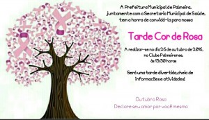 A Secretaria Municipal de Saúde em parceria com os Sindicatos Rural e dos Trabalhadores Rurais de Palmeira vão realizar nesta quarta-feira (26) a partir das 13h30 a “Tarde Cor de Rosa” no Clube Palmeirense. Na programação consta a palestra com a Mestre em Enfermagem Paula Freitas de Ponta Grossa. Em seguida será feita a demonstração de produtos e depois será servido um café colonial.