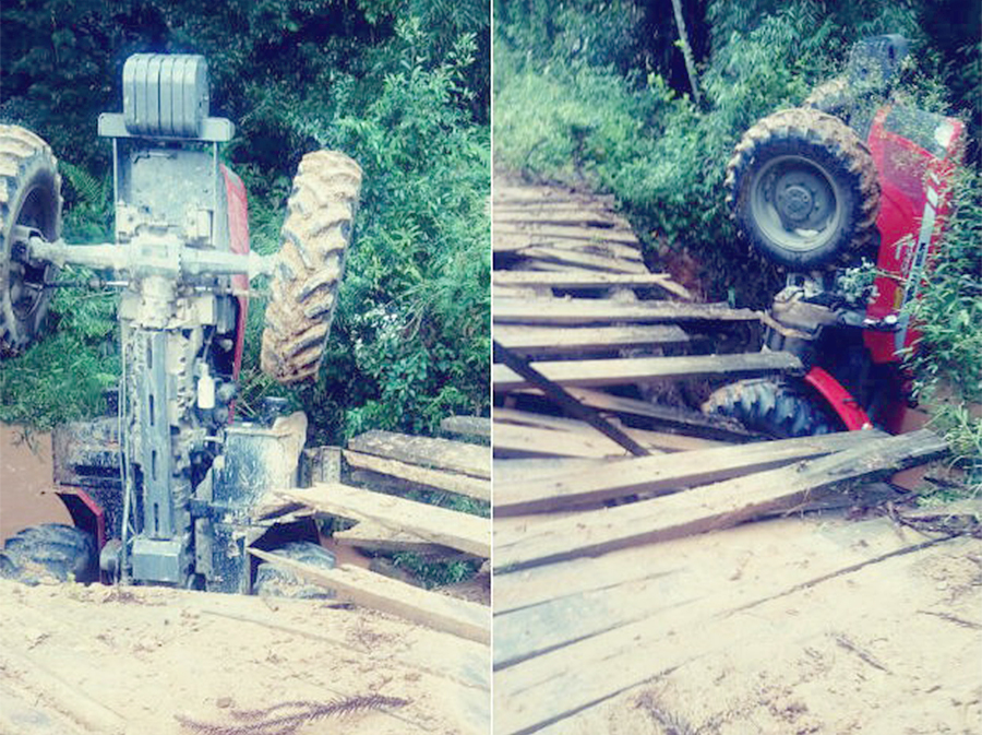 Trator despenca de ponte de madeira e dificulta acessos dos moradores