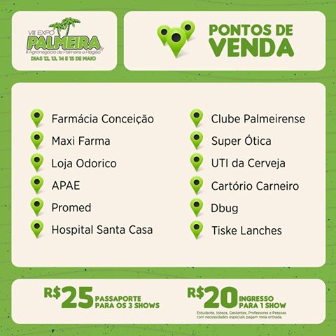 Os ingressos serão vendidos em diversos pontos na cidade: Farmácia Conceição filial 2,Maxi Farma, Loja Odorico, APAE, Promed, Santa Casa, Clube Palmeirense,Super Ótica, UTI da Cerveja, Cartório Carneiro, D’Bug e Tiske Lanches.