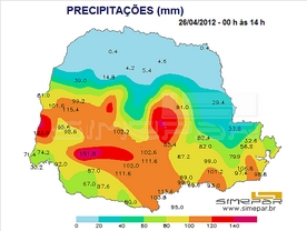Um sistema de baixa pressão mantém o tempo instável sobre todas as regiões do Paraná nesta quinta-feira (26). Em Palmeira, desde o final da tarde de terça-feira (25) até o início da tarde de quinta-feira, a precipitação de chuva chegou próxima a 110 mm, que representa quase o total da média histórica para o mês de abril. Choveu continuamente durante a noite, a madrugada e toda a manhã.