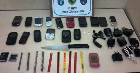 Diversos celulares, carregadores, baterias para celular, brocas, serras e uma faca grande foram apreendidos. Todo o material ilícito foi encaminhado até a Delegacia, junto aos dois menores de 16 anos.