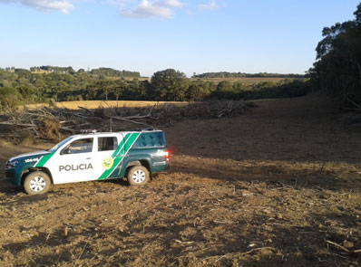 Às 16 horas, em Porto Amazonas, os policiais, em atendimento a denúncia na localidade de Nova Restinga, localizaram uma destoca com a destruição de vegetação nativa em estágio médio de regeneração do Bioma Mata Atlântica, mediante uso de trator esteira, em área correspondente a 2,8 hectares. O proprietário J. A. R., de 58 anos, morador de Palmeira, não possuía autorização florestal para a referida destoca.