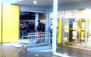 Ao chegar próximo do local, a equipe da PM escutou diversas explosões. Mesmo assim, os policiais se deslocaram até o endereço com as luzes da viatura apagadas, através de uma rua paralela. Já próximo do local, os policiais foram a pé e ao se aproximar do banco foram recebidos a tiros pelos bandidos e revidaram. Simultaneamente, aconteceram diversas outras explosões na agência.