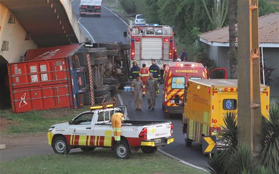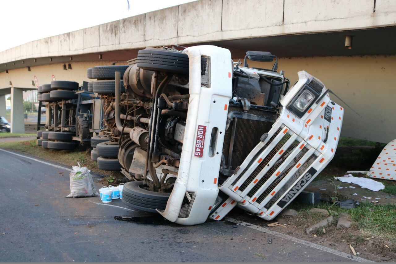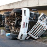 Um caminhão Scania de cor branca com placas HQR 8845 de São Carlos/SP, que transportava um container que estava carregado com chapas de alumínio tombou no final da tarde de quarta-feira (13), por volta das 17h30 na alça de acesso à PR 151 sentido à Palmeira. O motorista A.P. de 36 anos ao tentar entrar na alça de acesso, perdeu o controle da direção e tombou o veículo. Com o impacto, o caminhão foi parar embaixo do viaduto da rodovia.