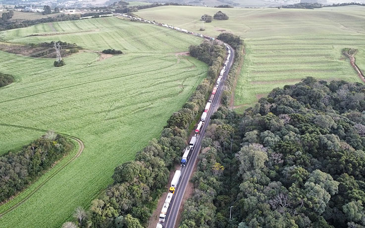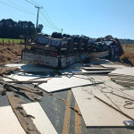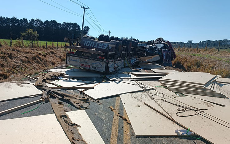 Um caminhão carregado com placas de compensado tombou em uma curva e deixou a pista totalmente interditada nos dois sentidos, a carga ficou espalhada. No local houve pelo menos 5 Km de congestionamento nos dois sentidos.