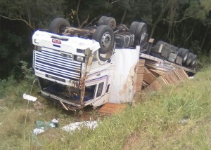 O Corpo de Bombeiros de Palmeira atendeu na manhã desta terça-feira (14) um acidente do tipo capotamento de uma carreta na PR 151 próximo a entrada da localidade de Poço Grande em Palmeira, no local conhecido como curva do Lageado. O acidente envolveu uma carreta Scania 113HW, placas LXY-1006 de Garibaldi/RS, conduzida por Gilmar de Araújo de 54 anos. O motorista teve ferimentos leves e foi encaminhado ao Hospital Santa Casa para atendimento médico.