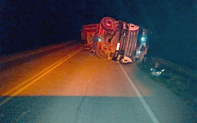 Na noite da quarta-feira (11), por volta das 22h30, a equipe do Corpo de Bombeiros de Palmeira se deslocou até o Km 396 na PR 151 na localidade de Mandaçaia para atender a um acidente do tipo tombamento. O local fica entre Palmeira e São João do Triunfo e a carreta bitrem Scania P 420 de cor branca, placas NLY 6085 de Telêmaco Borba e reboques AOH 1753 e ALZ 4961 da mesma cidade acabou tombando, sendo que o motorista de iniciais P.A.D.S., de 50 anos ficou preso nas ferragens.
