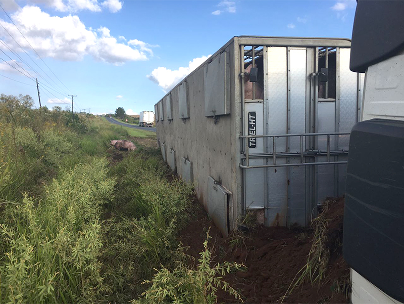 Carreta carregada de suínos capotou na última sexta-feira na PR 151 próximo ao rio Caniú