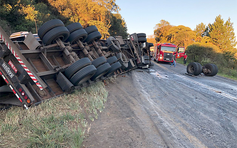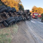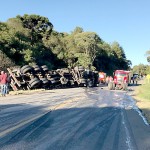 Carreta tomba na PR 151 na Serrinha e acaba atingindo outro caminhão